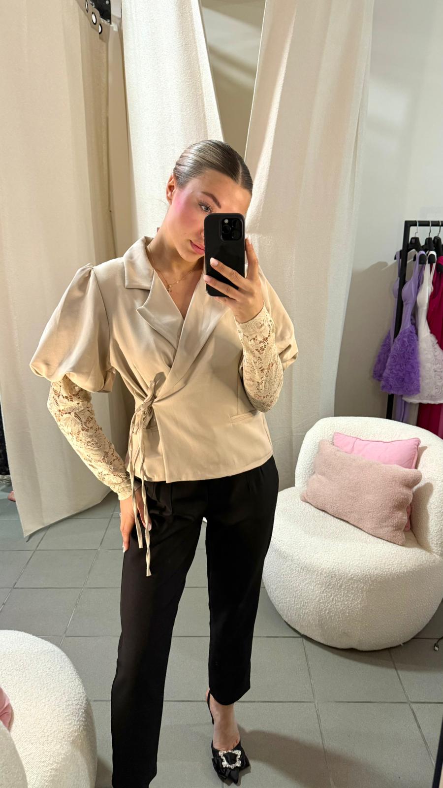 Acest blazer bej cu mâneci din dantelă adaugă o notă sofisticată și feminină oricărei ținute. Designul petrecut accentuează talia într-un mod elegant, iar mânecile bufante combinate cu detalii din dantelă creează un contrast rafinat între clasic și modern